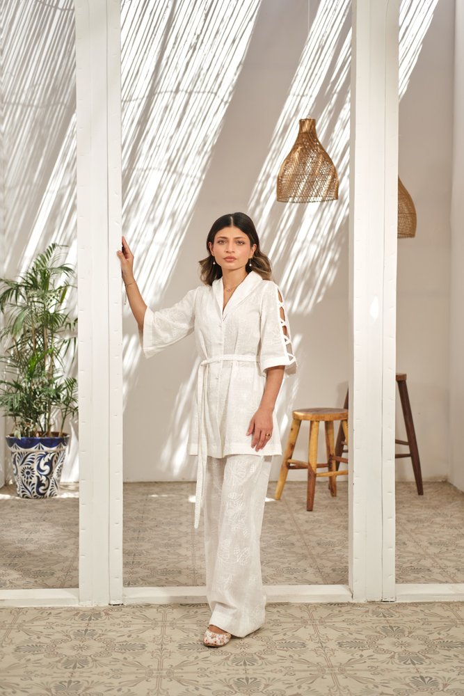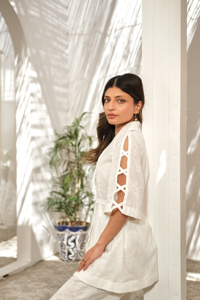 Soft florals and dreamy whites come together in Aura, featuring delicate criss-cross cutwork sleeves and a flattering tie-waist for the perfect summer.