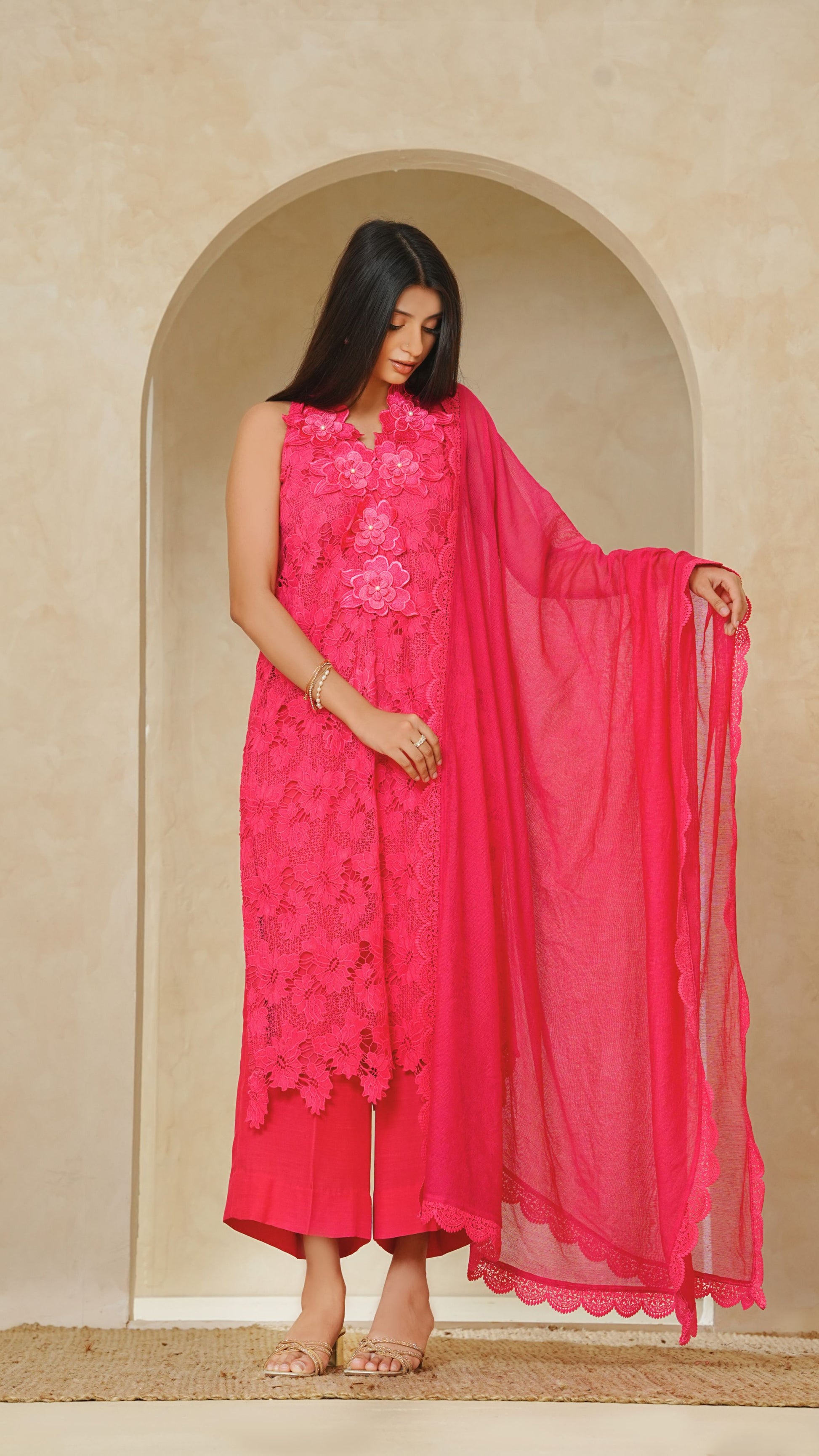 A gentle ode to summer serenity, Melon Muse is a dreamy ensemble crafted in a refreshing melon hue. The top is intricately crocheted, offering a delicate texture that blends artisanal charm with modern grace. Its floral neckline is elevated with 3D lace and pearl detailing, adding a touch of opulence to this soft, romantic piece. Paired with tailored raw silk pants that lend structure and sophistication, the look is completed with a melon-toned cotton net dupatta, edged with scalloped lace. Light, airy, and effortlessly feminine.
